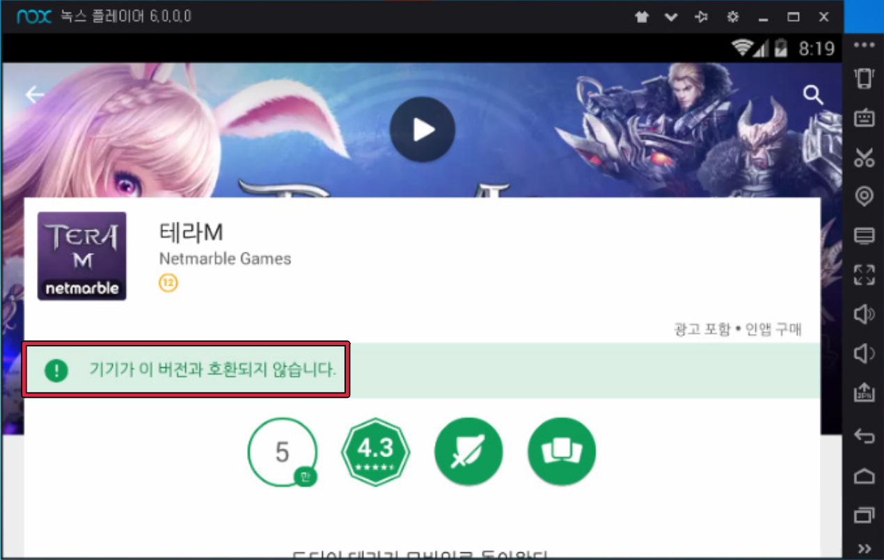 녹스 앱 플레이어에서 특정 모바일 게임 또는 어플을 다운로드하려고 할때 발생할 수 있는 기기 호환 관련 문제입니다.