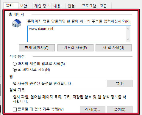 - 시작 옵션: 인터넷 익스플로러 11을 시작 시 처음으로 보여줄 탭을 설정합니다.