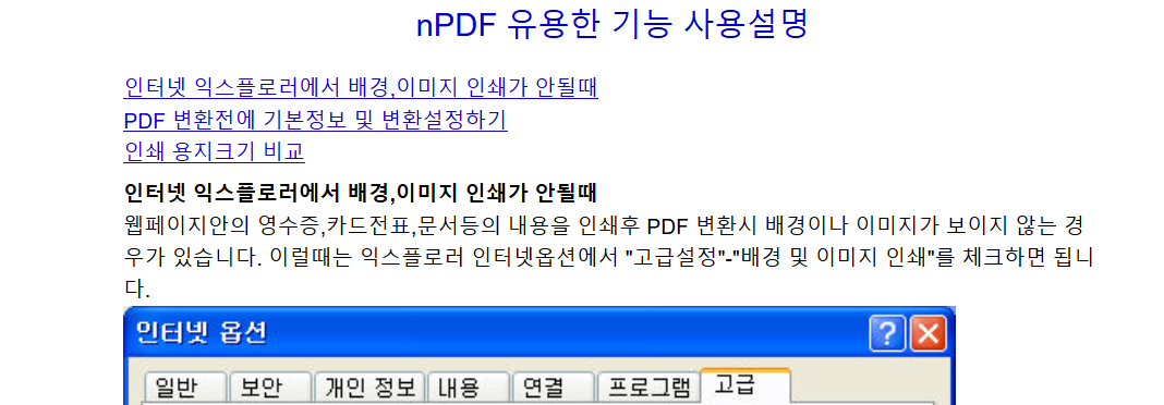 공유드린 링크를 통해 nPDF 사용법에 대한 페이지로 이동하면 인터넷 익스플로러 배경, 이미지 출력이 안될 때 / PDF 파일을 JPG로 변환하기 전에 기본 설정하는 방법 등등에 대한 nPDF 다운로드 후 사용법에 대해 정리되어 있습니다.