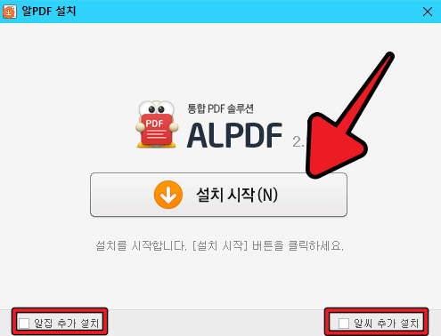▲ [설치 시작] 버튼을 클릭하면 ALPDF 설치가 바로 진행되며, 하단에 알툴즈의 프로그램인 알집 및 알씨를 추가적으로 설치할 것인지에 대한 여부를 체크해주세요.