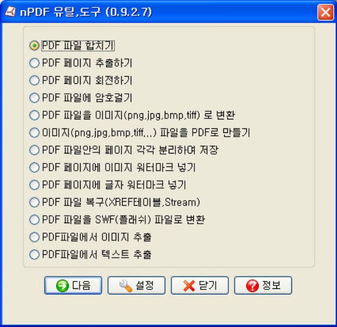 | PDF 파일 합치기 / PDF 페이지 분할 / PDF 프린트 출력 / PDF 텍스트 추출 | |