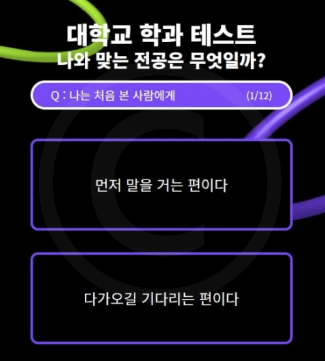학과 테스트는 간단한 질문에 답변을 하는 식으로 진행되며 총 12 문항의 답변을 해야 어울리는 학과를 찾을 수 있는 테스트입니다.