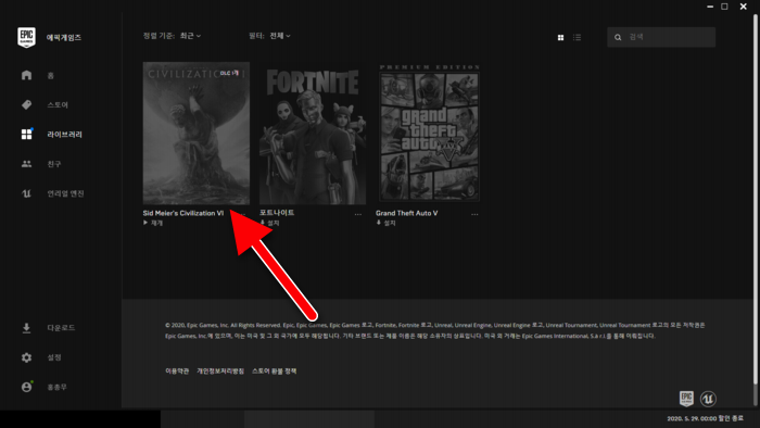 ▲ 에픽게임즈 런처를 실행하여 문명6 무료 라이센스를 받은 아이디로 접속하여 런처의 좌측 메뉴 중 [라이브러리]를 클릭하여 무료로 배포받은 게임이 잘 보관이 되어있는지 확인하시고 클릭하여 다운로드 및 설치를 진행합니다.