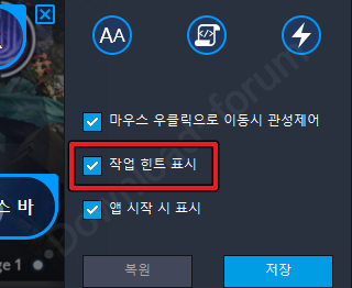 가상키 설정 하단에 [작업 힌트 표시] 체크 버튼을 클릭하면, 오른쪽 이미지와 같이 게임 플레이 중 바로 단축키를 확인할 수 있습니다. 반대로 단축키 표시가 마음에 들지 않으면 체크를 해제하시면 됩니다.