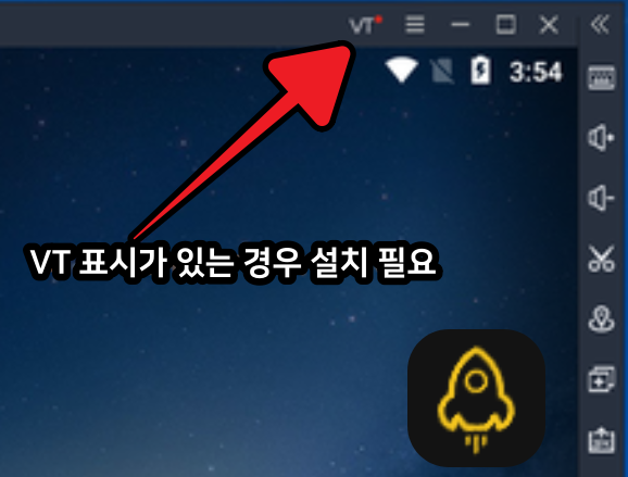 LD플레이어를 실행하여 우측 상단을 확인해보면, VT 라는 안내문구가 확인된다면 VT 활성화 진행을 해줘야합니다. LD플레이어에서 VT를 확인할 수 없는 분들은 이미 활성화가 되어있다는 의미로 따로 진행할 필요 없습니다.
