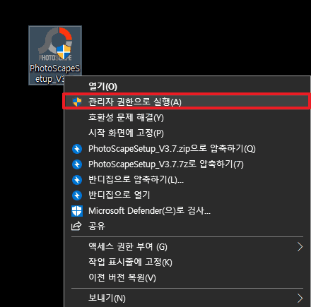 다운로드가 완료되면, 포토스케이프 설치 파일을 마우스 오른쪽 클릭 후 [관리자 권한으로 실행]하여 설치를 진행해주세요.