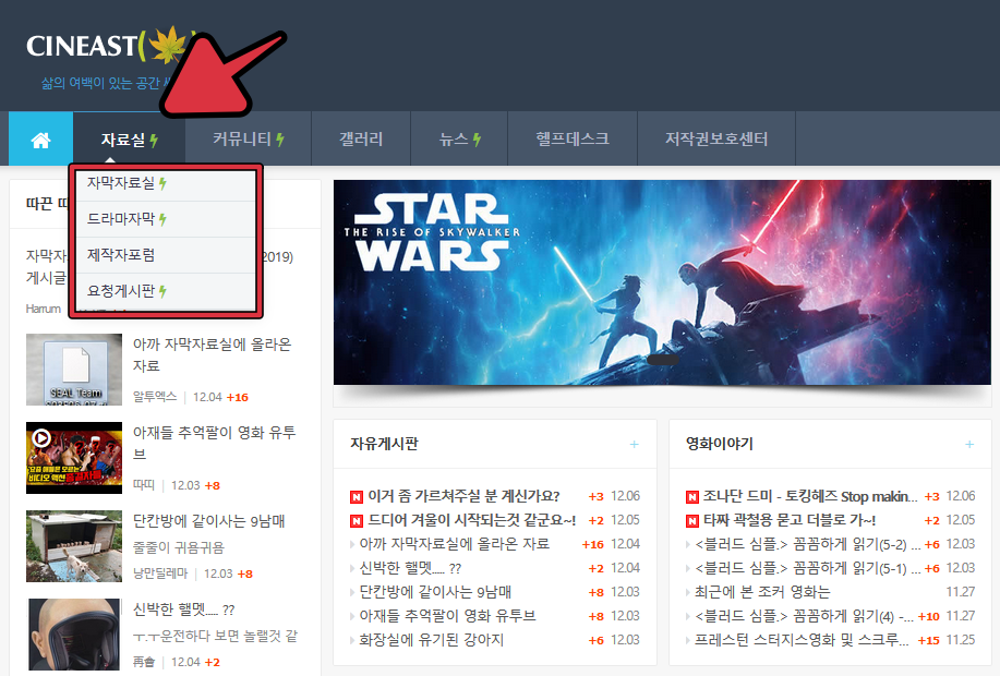 두 번째로 추천드리는 자막 자료실 씨네스트입니다. 공유드린 링크를 통해 상단 [자료실] 메뉴로 들어가 원하시는 영상의 자막을 검색할 수 있습니다.