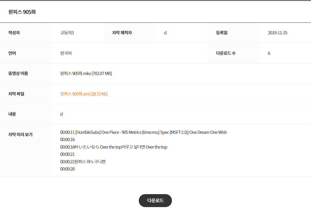 원하는 동영상 파일의 자막을 검색하셨다면 위와 같이 자막 미리 보기 및 하단에 다운로드 버튼을 클릭하여 다운로드할 수 있습니다.