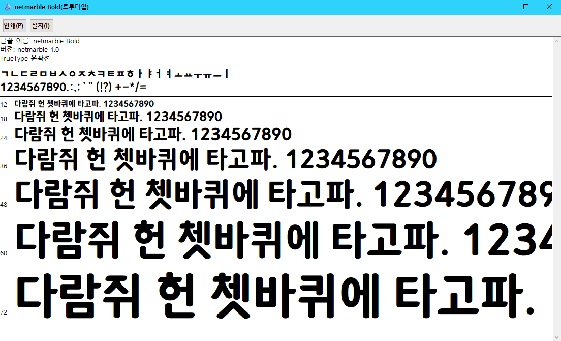 사용하고자 하는 사이즈의 넷마블체 TTF 파일을 클릭하여 컴퓨터에 해당 한글 폰트를 적용하여 사용할 수 있습니다.