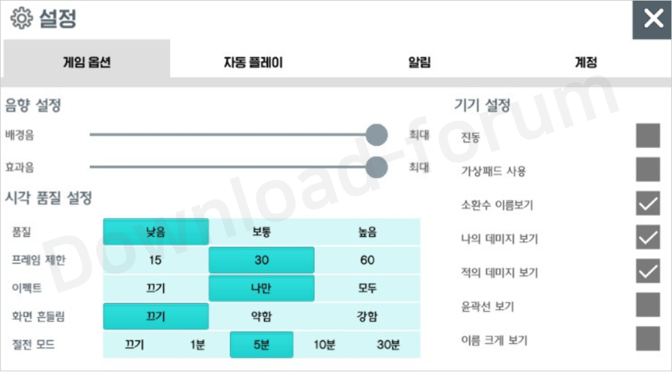 - 프레임 제한 : 30 프레임 설정 (렉 발생 시 15 프레임)