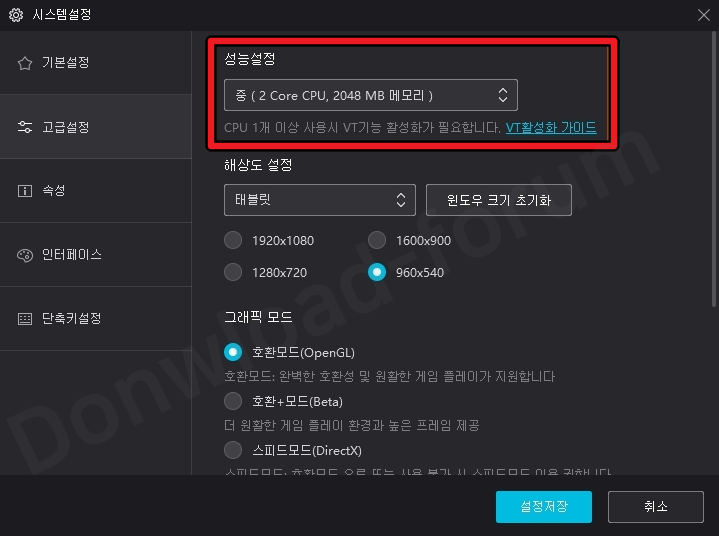 녹스 최신 버전 다운로드 완료 후 가장 먼저 해야 할 것은 녹스 앱 플레이어의 간단한 설정입니다. 달빛조각사 플레이를 하신다면 아래와 같은 설정을 추천합니다.