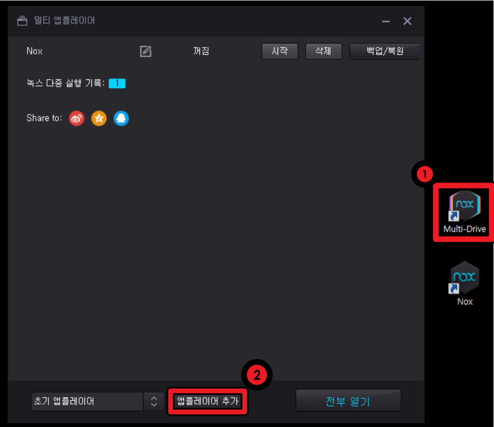 - 먼저 녹스 앱플레이어 다운로드 시 같이 설치되는 녹스 멀티 드라이브를 실행합니다.