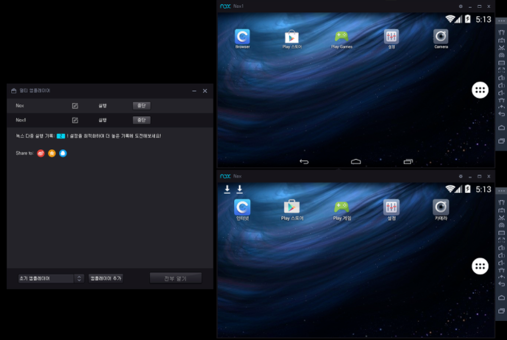 녹스 앱플레이어를 멀티로 두개 실행할 시 위와 같이 앱플레이어 상단에 각각의 앱플레이어 이름이 표시되는데요. 이 이름은 멀티 앱플레이어 내에서 설정을 변경하여 멀티 앱플레이어를 관리할 수 있습니다!