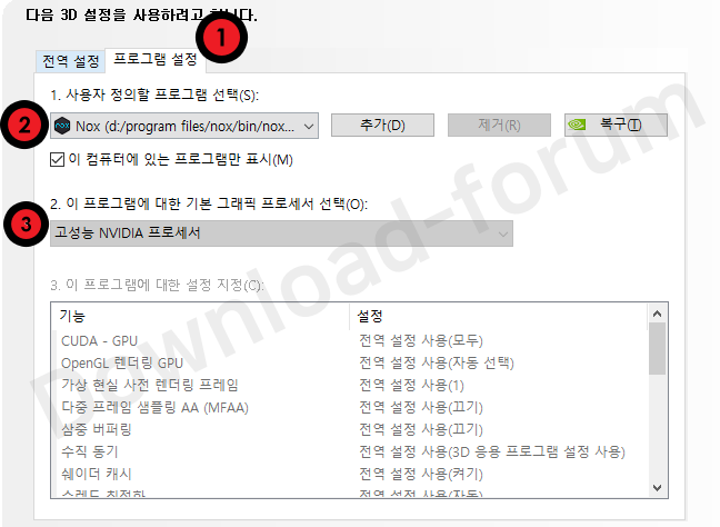 1. 3D 설정 관리 창에서 가장 위에 있는 [프로그램 설정]을 클릭합니다.