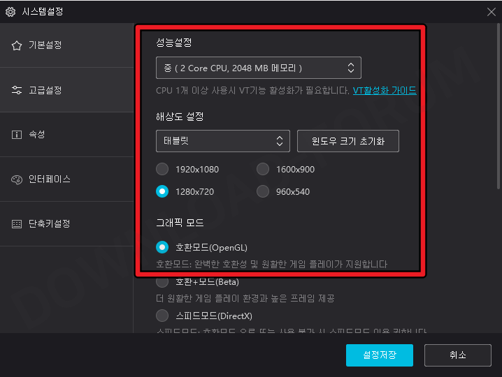 3. 그래픽 모드는 호환 모드로 설정합니다. 반대로 고사양 설정은 스피드모드 설정 가능