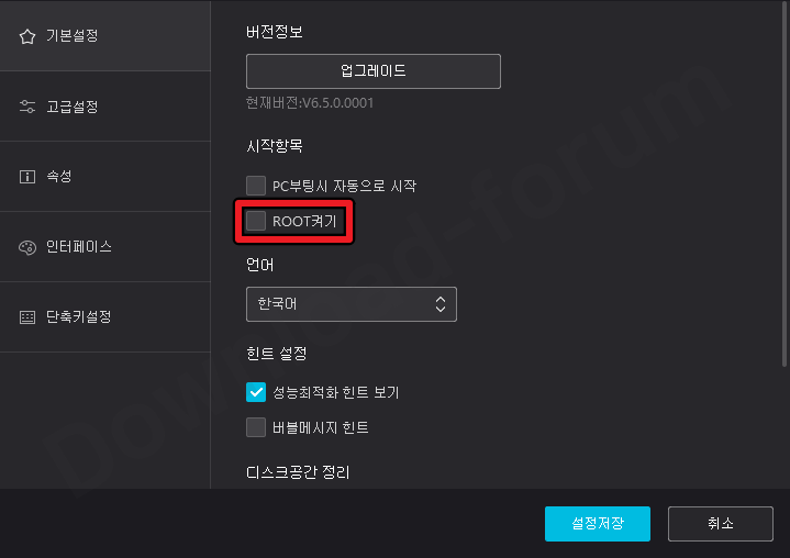 녹스 앱플레이어 설정창으로 이동하는 것은 모두 알 것이라고 생각하고 바로 세팅법 알려드릴게요. 먼저 기본 설정에서는 ROOT 켜기를 해제합니다. 성능과는 크게 상관이 없으나 채굴 앱이 강제로 설치되는 것을 방지할 수 있습니다.