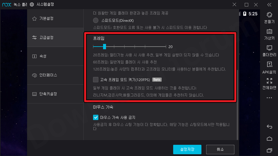 V4 플레이를 위한 녹스 앱플레이어 기본 설정 최적화의 마지막인 프레임입니다.