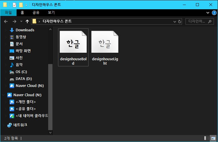 ▲ 디자인하우스체 TTF 폰트 설치 파일을 다운로드하면 위와 같이 두 종류의 파일이 생깁니다. 여기서 원하는 폰트 파일을 더블 클릭하여 사용 중인 컴퓨터에 폰트를 적용할 수 있습니다.