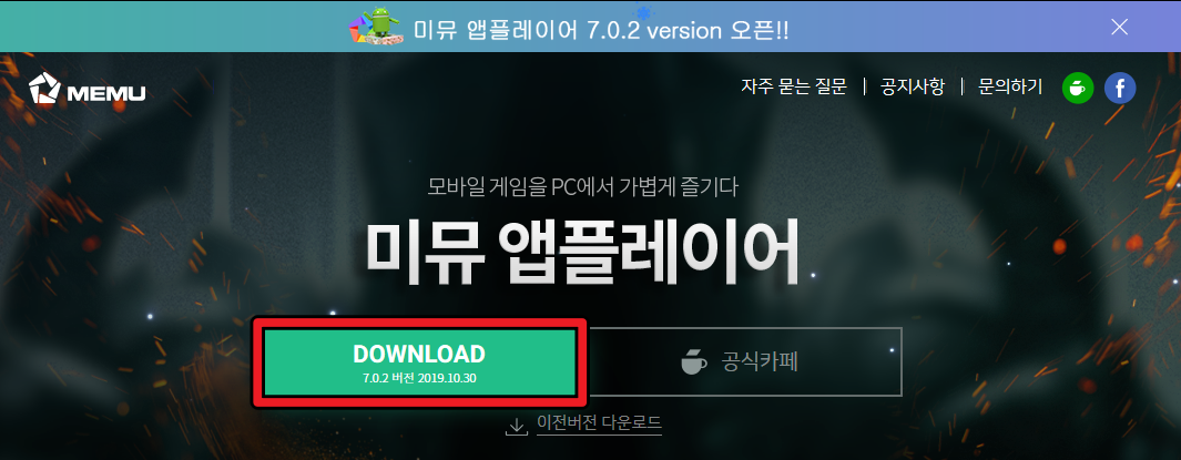 공유드린 링크를 통해 미뮤 앱플레이어 공식 홈페이지로 이동하면 위와 같이 최신 버전인 미뮤 앱플레이어 7.0.2 버전 다운로드 링크를 공유하고 있습니다.