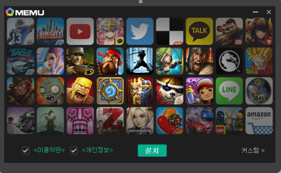 공식 홈페이지에서 미뮤 앱플레이어 인스톨 파일을 다운로드 후 파일을 더블 클릭하여 설치를 진행합니다. 우측 하단에 [커스텀] 버튼을 통해 미뮤 앱플레이어가 설치되는 경로를 지정할 수 있습니다.
