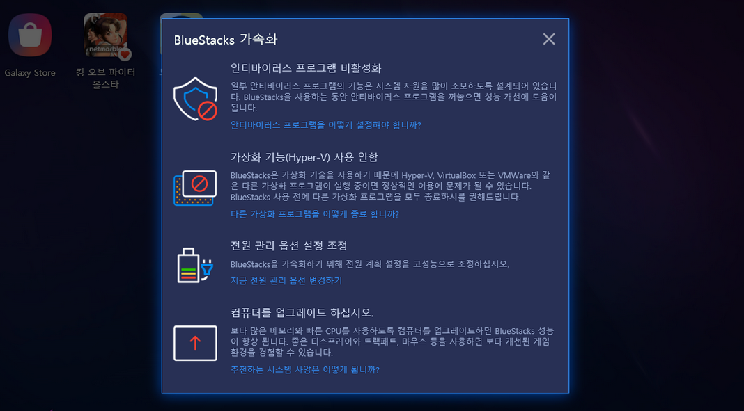 블루스택의 스피드 모드 최적화 설정이 원활히 진행되지 않을 경우 다이렉트x 최신 버전으로 사용 중인 윈도우에 업데이트를 진행해주세요.