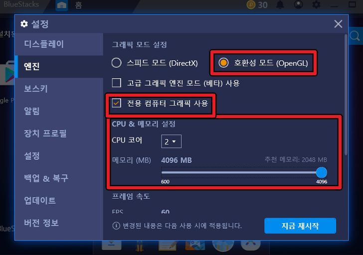 이 부분은 블루스택 4로 달빛조각사 플레이 시 그래픽 카드 사용 설정이 되지 않는 분들을 위한 팁입니다.
