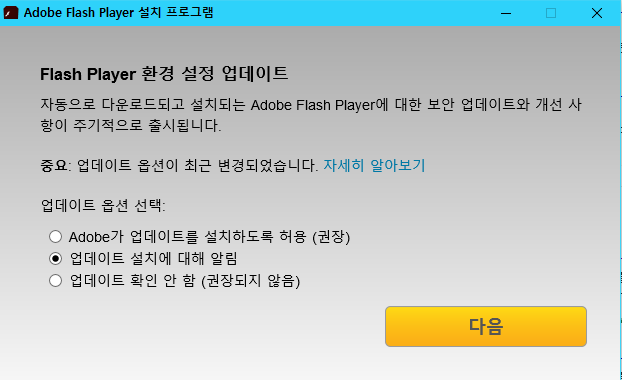 ▲ 설치를 진행하기 전에 어도비 플래시 플레이어 업데이트 관련 사항이 나옵니다. 여기서 [업데이트 설치에 대해 알림]으로 설정하시는 것을 추천드립니다.