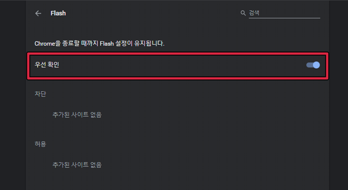 ▲ 실행이 차단된 어도비 플래시 플레이어를 위와 같이 [우선 확인]으로 변경하여 활성화시켜주면 크롬에서 어도비 플래시 플레이어를 실행할 수 있습니다.