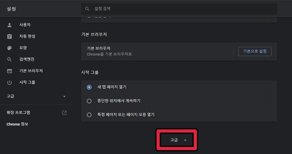 ▲ 구글 크롬의 설정 창의 하단에 [고급] 버튼을 클릭합니다.