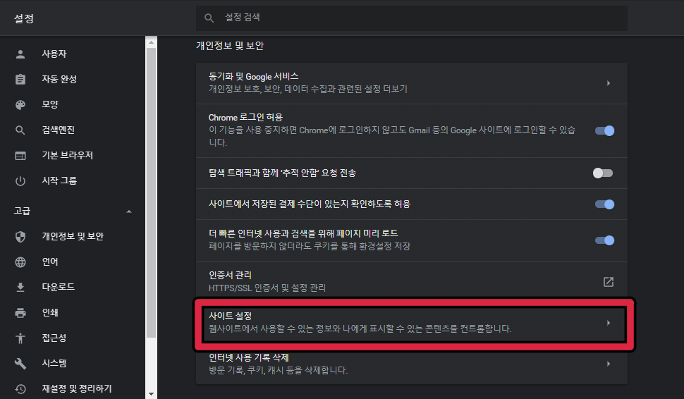 ▲ 구글의 개인정보 및 보안 탭에서 [사이트 설정] 메뉴를 확인할 수 있습니다.