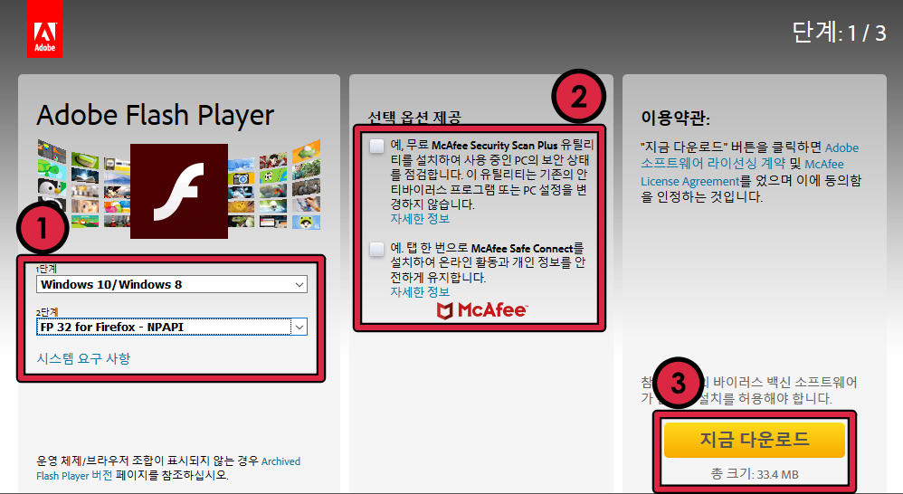 ▲ 먼저 공유드린 링크를 통해 Adobe Flash Player 최신 버전 다운로드 페이지로 이동합니다. 또는 아래 첨부파일을 다운로드하세요.