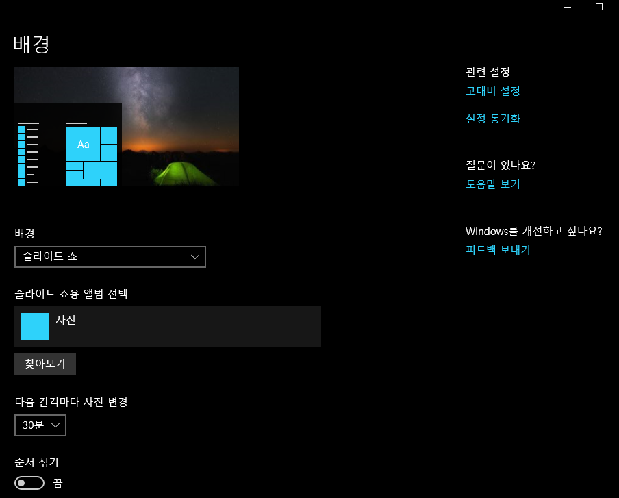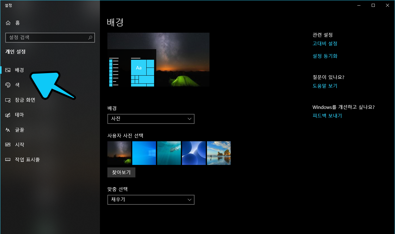 윈도우10에서 바탕화면은 사진, 단색, 슬라이드쇼 이렇게 총 3가지의 종류를 선택하여 바꿀 수 있습니다. 각 종류의 세부 사항등도 조정할 수 있습니다. 아래를 참고해주세요.