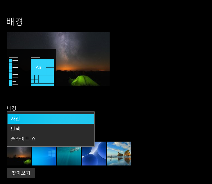 - 배경 종류 선택 (사진, 단색, 슬라이드쇼)