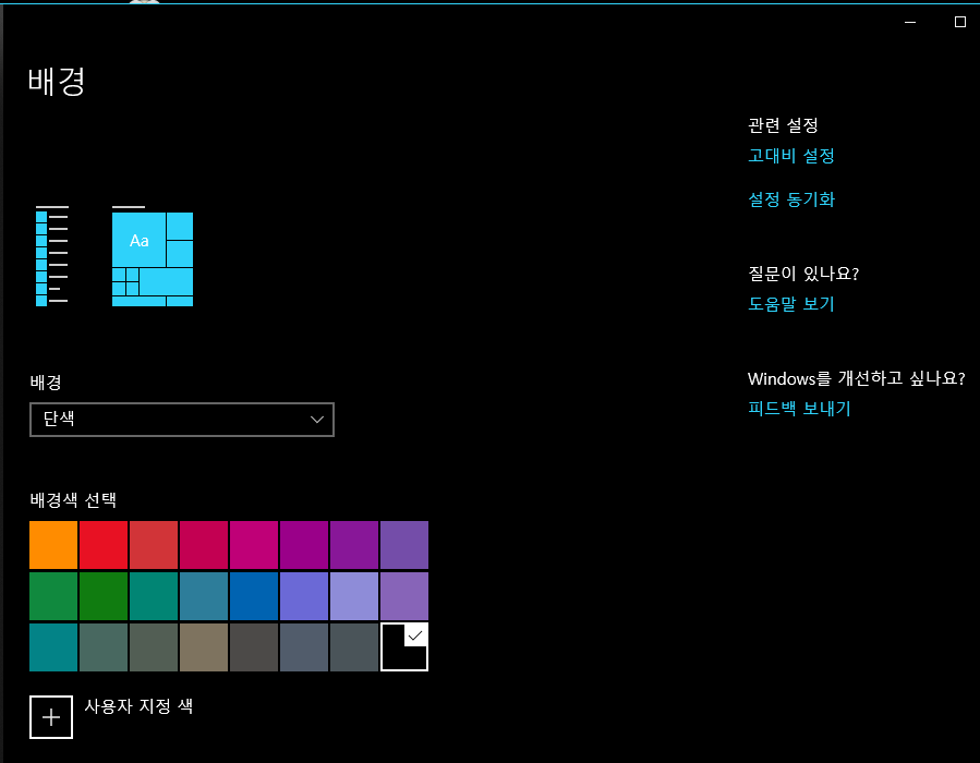 ▲ 저는 단색 바탕화면 설정을 좋아합니다. 가장 깔끔한 바탕화면이 아닐까 생각되는데요. 하단에 '사용자 지정 색' 메뉴를 통해 위에 제시된 색상 이외에도 세부적인 색상으로 배경화면을 변경할 수 있습니다.