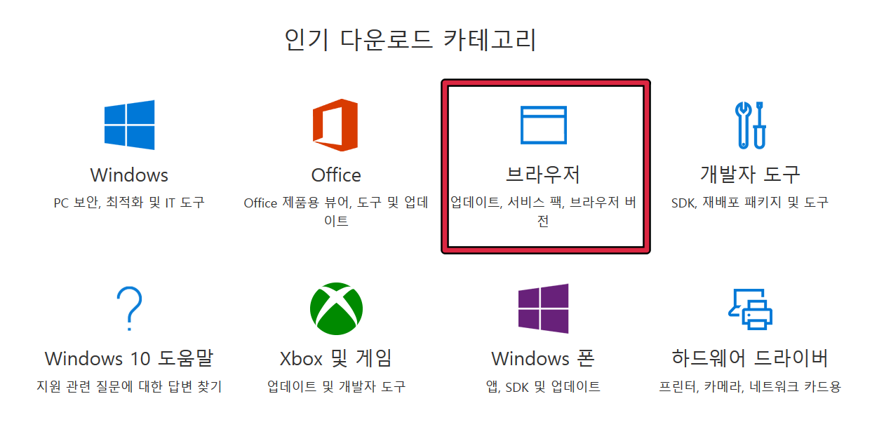 공유드린 링크를 통해 마이크로 소프트 다운로드 센터로 이동합니다. 인기 다운로드 카테고리 하단에 [브라우저] 메뉴로 이동하여 인터넷 익스플로러 11 최신 버전을 다운로드할 수 있습니다.