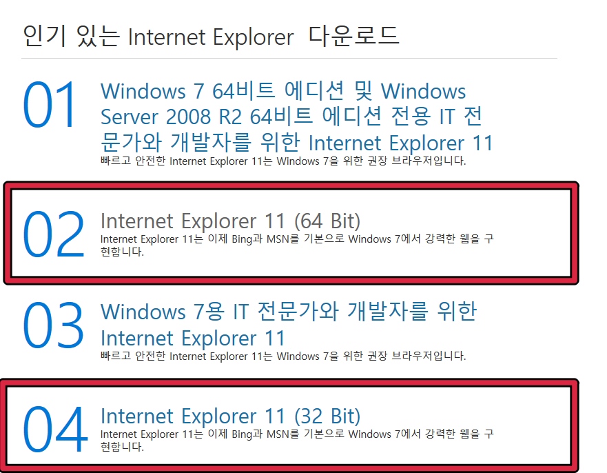 윈도우10 사용장의 경우 위와 같이 Internet Explorer 11 [32bit / 64bit] 중 적합한 것을 다운로드하시면 됩니다. 윈도우7 사용자분들은 3번의 윈도우 7용 인터넷 익스플로러 11을 다운로드하시면 됩니다!