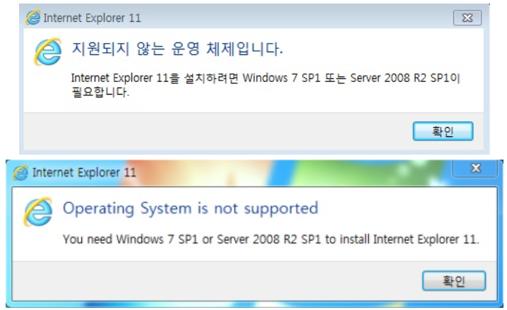 Internet Explorer 11 다운로드 및 설치시 발생하는 '지원되지 않는 운영 체제입니다.' Internet Explorer 11을 설치하려면 Windows 7 SP1 또는 Server 2008 R2 SP1이 필요합니다. 또는 You need Windows 7 SP1 or Server 2008 R2 SP1 to install Internet Explorer 11.' 관련 오류입니다.