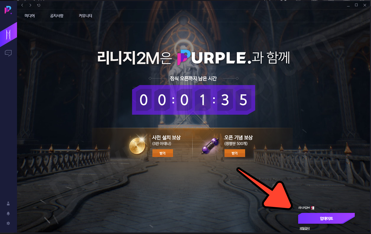 ▲ 저는 이미지 리니지2M PC 버전을 퍼플 앱 플레이어에 설치를 진행하였고 지금 막 리니지2M이 정식 출시되어 업데이트로 변경되었습니다. 처음 설치하시는 분들은 리니지2M PC 버전 설치 진행이라는 문구가 적혀있을 거예요