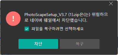 인터넷 웹 브라우저에서 설치 파일을 위험한 파일로 인식하면, [복구]를 클릭하여 다운로드를 진행합니다.