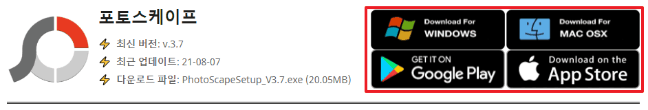 공유드린 링크를 통해 포토스케이프 다운로드 홈페이지로 이동하여, 사용중인 PC의 알맞는 운영체제의 포토스케이프 설치 파일을 다운로드합니다.