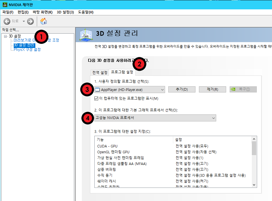 NVIDIA 제어판에서 위 이미지와 같은 순서로 세팅을 진행하시면 됩니다. 다만 ③의 지금 이미지 상 다른 프로그램으로 설정이 되어 있는데..