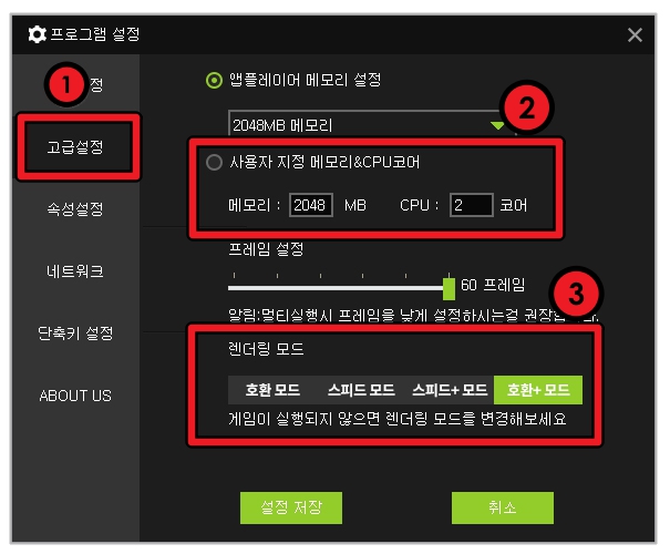 ▲ 메뉴 설정 중 고급설정 탭에서 사용할 모드, 메모리, 프레임에 대해 설정해야 하는데요. 아래를 참고하여 설정하세요.
