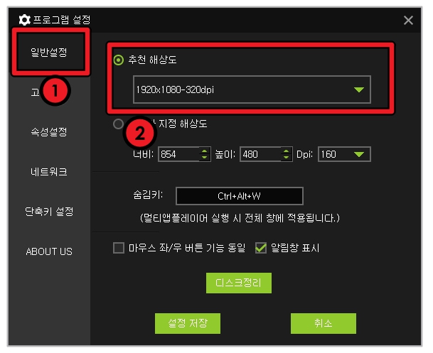 ▲ 다음으로 일반 설정 중 해상도 설정입니다. 해상도는 가장 높은 값을 추천드리나 사용 중인 컴퓨터의 사양을 고려하여 설정하시면 되는데요.