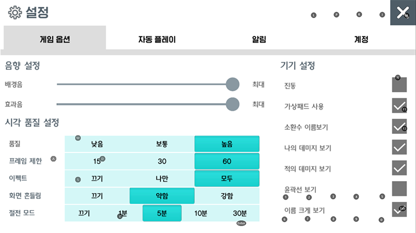위와 같이 설정하고 렉이 걸려 최적화 설정값을 조정하고 싶은 분들은 가장 먼저, 설정 우측에 [소환수 이름 보기], [적의 데미지 보기] 등을 체크 해제해보세요.