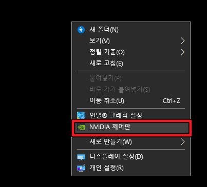 피크 앱플레이어에서 최신 모바일 게임 구동 시 그래피 카드를 사용할 수 있도록 설정하기 위해 바탕화면에 우클릭하여 NVIDIA 제어판으로 이동합니다.