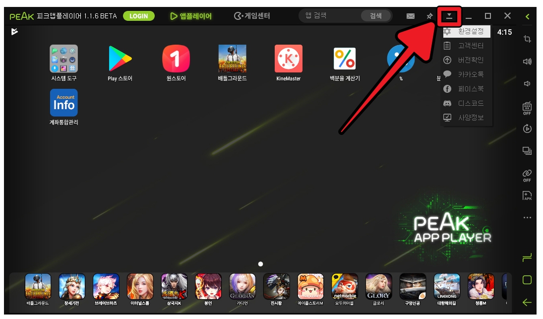 ▲ 피크 앱플레이어를 실행하여 우측 상단에 메뉴 버튼 중 환경설정 메뉴로 이동합니다.