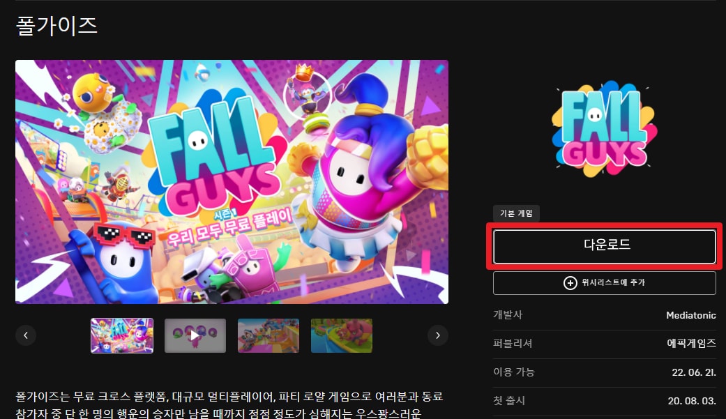 스팀에서 유료로 판매되던 폴가이즈(Fall Guys)가 무료로 전환됨에 따라 에픽게임즈 스토어 런처를 통해 폴가이즈를 무료로 다운로드할 수 있습니다. 아래 링크를 통해 에픽 게임즈 스토어 런처를 다운로드할 수 있습니다.