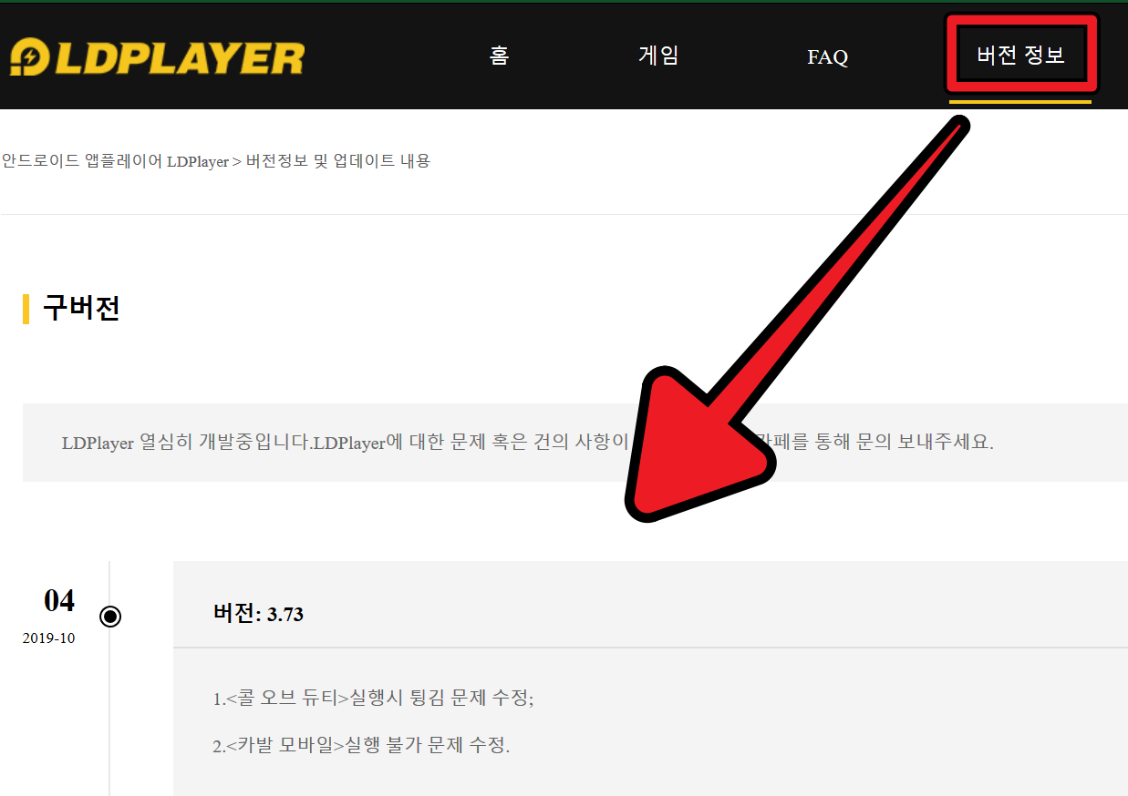 위에 공유드린 LD 플레이어 공식 홈페이지 상단 메뉴에 '버전 정보'라는 항목을 클릭하면 여태까지 진행된 업데이트의 과정 뿐만 아니라 해당되는 구버전을 바로 다운로드 받을 수 있습니다.