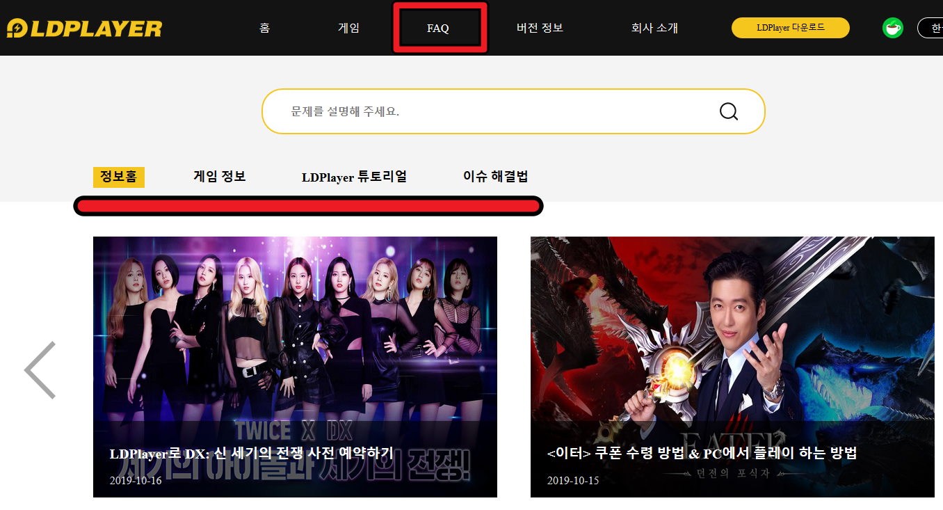 LD플레이어 다운로드 후 홈페이지 상단에 FAQ라는 메뉴에 들어가면 각 게임에 맞는 최적화 및 속성설정, VT 설정, 다운로드 속도 문제 등등 다양한 정보를 제공하고 있습니다.