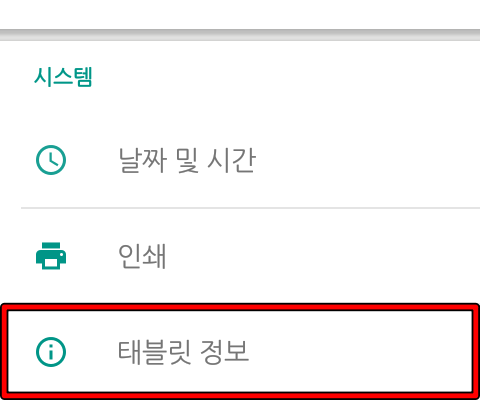 ▲ 설정의 메뉴 중 하단 시스템 메뉴에 포함되어 있는 태블릿 정보를 연타하면 개발자가 사용할 수 있는 메뉴로 들어갈 수 있습니다.